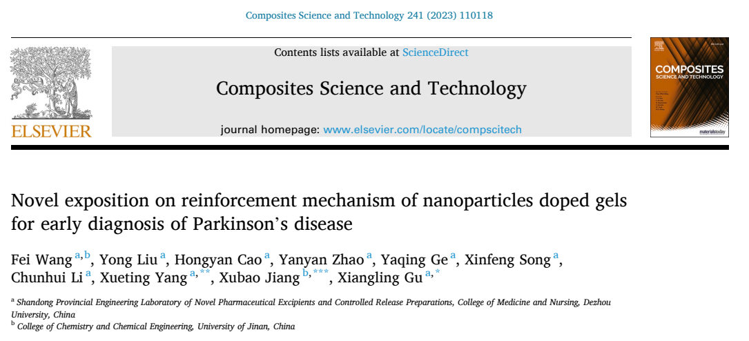 近日,医护学院药辅团队顾相伶课题组,依托新型药物辅料和缓控释制剂山东省工程研究中心,在帕金森疾病早期诊断医用凝胶的作用机制研究中取得最新成果。该课题组将聚苯胺纳米粒子(PANI NPs)掺杂到高分子水凝胶中,基于凝胶网络中的氢键及苯环间的疏水缔合作用的叠加效应,实现了凝胶力学和导电性能的增强。所制得的复合水凝胶在帕金森疾病的早期检测中具有潜在的价值。相关研究成果以德州学院为第一单位,“Novel exposition on reinforcement mechanism of nanoparticles doped gels for early diagnosis of parkinson's disease”为题发表在国际期刊《Composites Science and Technology》(中科院一区,IF=9.879)。