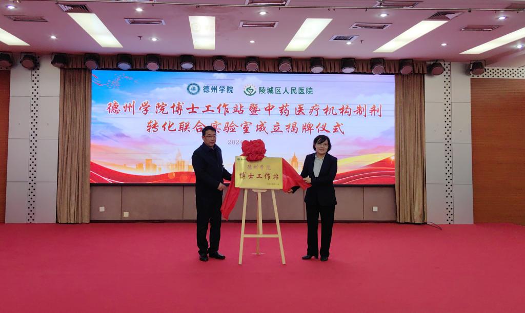 3月27日,德州学院博士工作站暨中药医疗机构制剂转化联合实验室(一站一室)成立揭牌仪式在陵城区人民医院办公楼五楼学术报告厅举行。学校党委委员、副校长单振涛出席揭牌仪式并致辞。市中医药管理局副局长、三级调研员孔祥勇,青囊堂中医药科技(山东)有限公司董事长张志刚,陵城区人民政府副区长韩晓丽、陵城区卫健局局长刘智国,陵城区人民医院副院长闫书环和王清胜等出席会议。学校合作发展处负责人,医药与护理学院相关负责人和博士教师代表参加揭牌仪式。