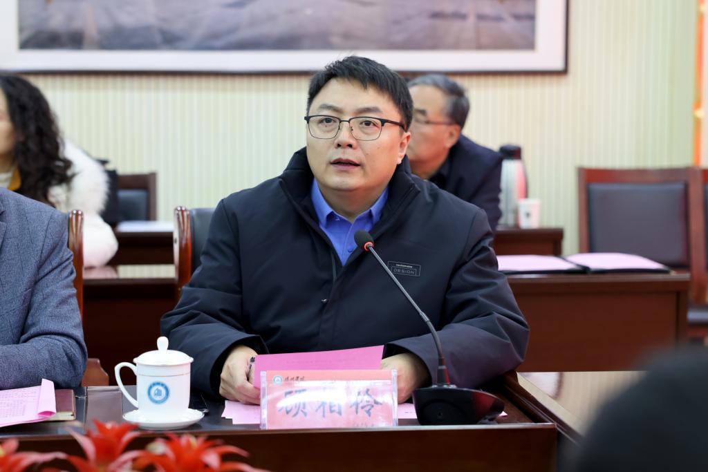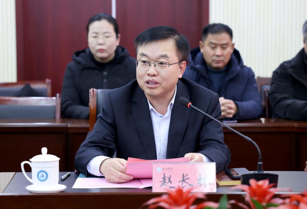 赵长林致辞,他向大会的召开表示祝贺,向长期以来支持学校事业发展的领导、嘉宾的到来表示欢迎和衷心的感谢,向共建单位表示真诚敬意。赵长林介绍了学校办学历史况和事业发展情况,重点介绍了学校深入推动产教融合、服务地方经济社会发展情况。他说,山东大学齐鲁医院德州医院与我校共建现代医药产业学院,是服务国家医药产业高质量发展战略和区域医药产业对科技、人才需求的务实举措。希望双方按照共建共享、资源融合、互利双赢的原则,坚持项目化、平台化运行,聚焦德州中医药、功能性食品产业发展需求和医工交叉融合、智能医疗、智改数转等领域,强化特色,形成优势,协同育人,共同将德州学院现代医药产业学院打造成育人成效显著、服务区域医药产业能力强、产学研用联动机制成果显著、在省内有较强影响力的现代产业学院,为德州和山东医药健康产业提供有力的人才支持和智力支撑。