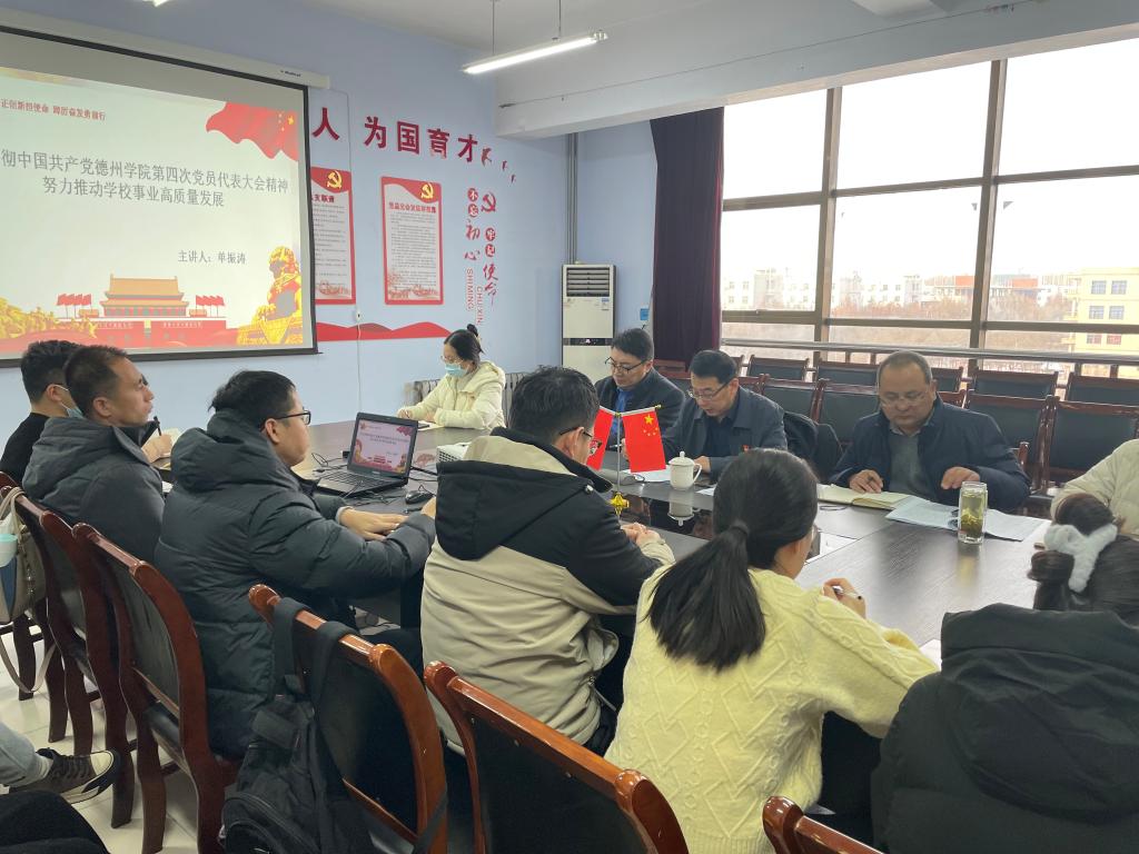 单校长以《学习贯彻中国共产党德州学院第四次党员代表大会精神,努力推动学校事业高质量发展》为题,从深刻认识第四次党代会重大意义、深刻把握第四次党代会精神实质和丰富内涵和以实际行动推动党代会确定的各项工作任务落地落实三个方面,全面阐述了学校第四次党员代表大会精神的丰富内涵。围绕“一四九三”工作要求,即紧紧围绕建设高水平有特色国际化应用型大学这一目标,深入推进人才优先、创新驱动、特色发展、国际化四大战略,大力实施铸魂育人、学科筑峰、人才汇聚、协同创新、开放提质、治理优化、条件提升、民生改善、文化赋能九项工程,努力实现应用转型、办学层次、治理能力三个蝶变,全面解读了学校第四次党员代表大会报告。