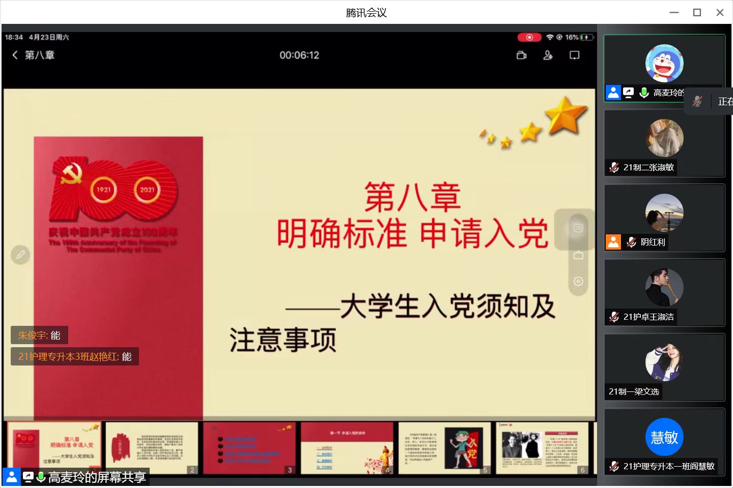 4月23日晚,医药与护理学院第34期入党积极分子培训班在腾讯会议持续开讲,医药与护理学院第二学生党支部组织委员高麦玲老师以《明确标准 申请入党》为主题,为全体入党积极分子上了一堂生动的党课。