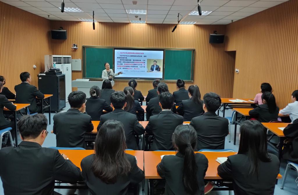 党课围绕习近平总书记教育重要论述,分别从时代背景、战略意义、思想精髓、时代使命四个方面深刻阐述了“为谁培养人、培养什么人、怎样培养人”这一教育的根本问题。徐静校长指出,作为新时代青年学子,生逢其时,施展才干的舞台无比广阔,实现梦想的前景无比光明。一定要认真学习贯彻习近平总书记关于教育的重要论述,树立对马克思主义的信仰、对中国特色社会主义的信念、对中华民族伟大复兴中国梦的信心,要肩负起历史使命,坚定前进信心,立大志、明大德、成大才、担大任,努力成为堪当民族复兴重任的时代新人,把青春奋斗的热血写在历史丰碑上,为全面建设社会主义现代化国家、全面推进中华民族伟大复兴作出新贡献。