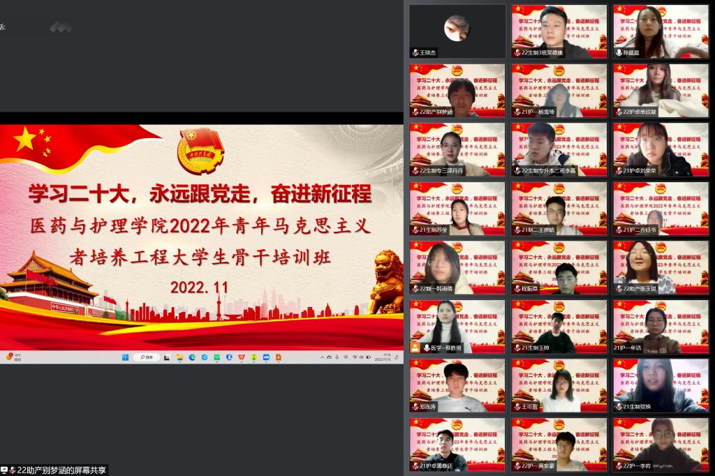 为认真学习贯彻党的二十大精神,培育“对党忠诚、信仰坚定、素质突出、作风过硬”的青年政治骨干,切实加强我院团学干部队伍建设,培养一批信仰坚定、能力突出、素质优良、作风过硬的青年政治骨干。11月15日,医药与护理学院举办青年马克思主义者培养工程大学生骨干班开班仪式,团委书记主持,党委书记、党委副书记出席,辅导员老师、全体参训学员参加。