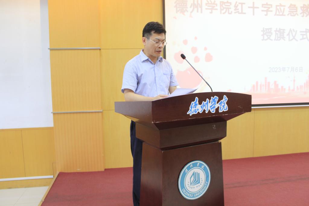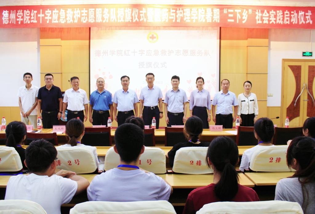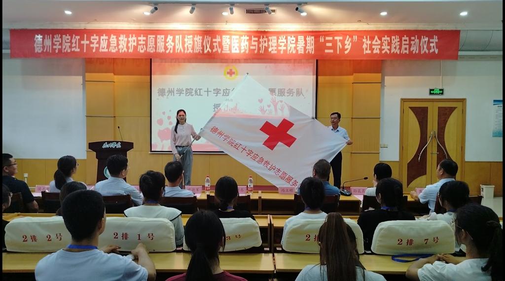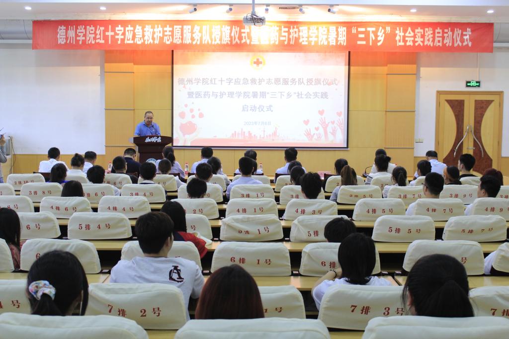 为弘扬“人道、博爱、奉献”的红十字精神和“奉献、友爱、互助、进步”的志愿服务精神,更好地推进暑期“三下乡”社会实践活动深入开展。7月6日下午,医药与护理学院于厚德楼四楼报告厅举办德州学院红十字应急救护志愿服务队授旗仪式暨暑期“三下乡”社会实践启动仪式。德州学院党委委员、副校长迟沂军、德州市红十字会常务副会长李福辉、德州市红十字会党组成员、副会长黄卫东、德州学院团委书记王凤群出席,医药与护理学院相关负责人、市红十字会应急救护培训中心相关负责人及学生志愿者共百余人参加。