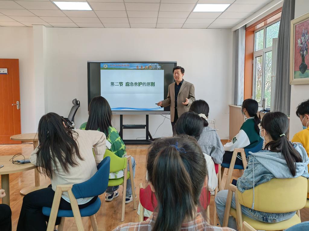 董老师从应急救护概念、应急救护原则、外伤救治四项基本技术、气道阻塞急救、心肺复苏、意外伤害救护六部分展开,详细讲述了应急救护的概念、作用等相关知识,带领同学们共同学习了救护的基本技能与方法。现场同学们同学们认真学习,积极交流、互动,并表示受益匪浅。