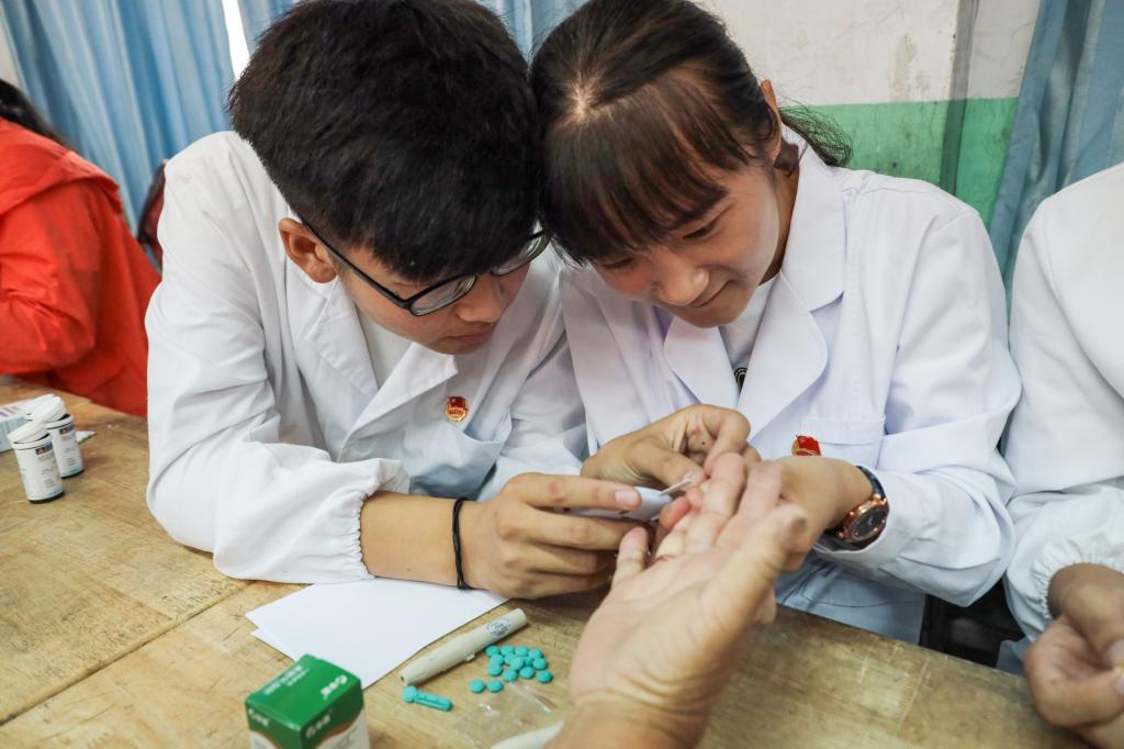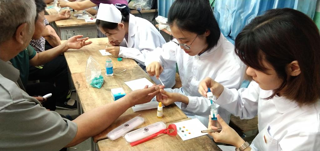 在三下乡社会实践活动中,医药与护理学院服务队以“携手医学梦,健康中国行”为主题,为社区居民、教师和第一书记们开展了测量血压、血型、血糖等健康普查,为农村留守老人和小学生开展安全教育,进行急救知识与技能培训,健康知识宣讲等一系列活动。志愿服务队充分利用宣传册、海报、标语等有效宣传工具,耐心、细致地为村民普及糖尿病防治知识、高血压防治知识、夏季预防肠道疾病的常识、夏日防中暑知识以及呼吸道传染病的个人防护措施,集中组织村民现场讲授心肺复苏技术以及常见外伤的紧急处理方法。