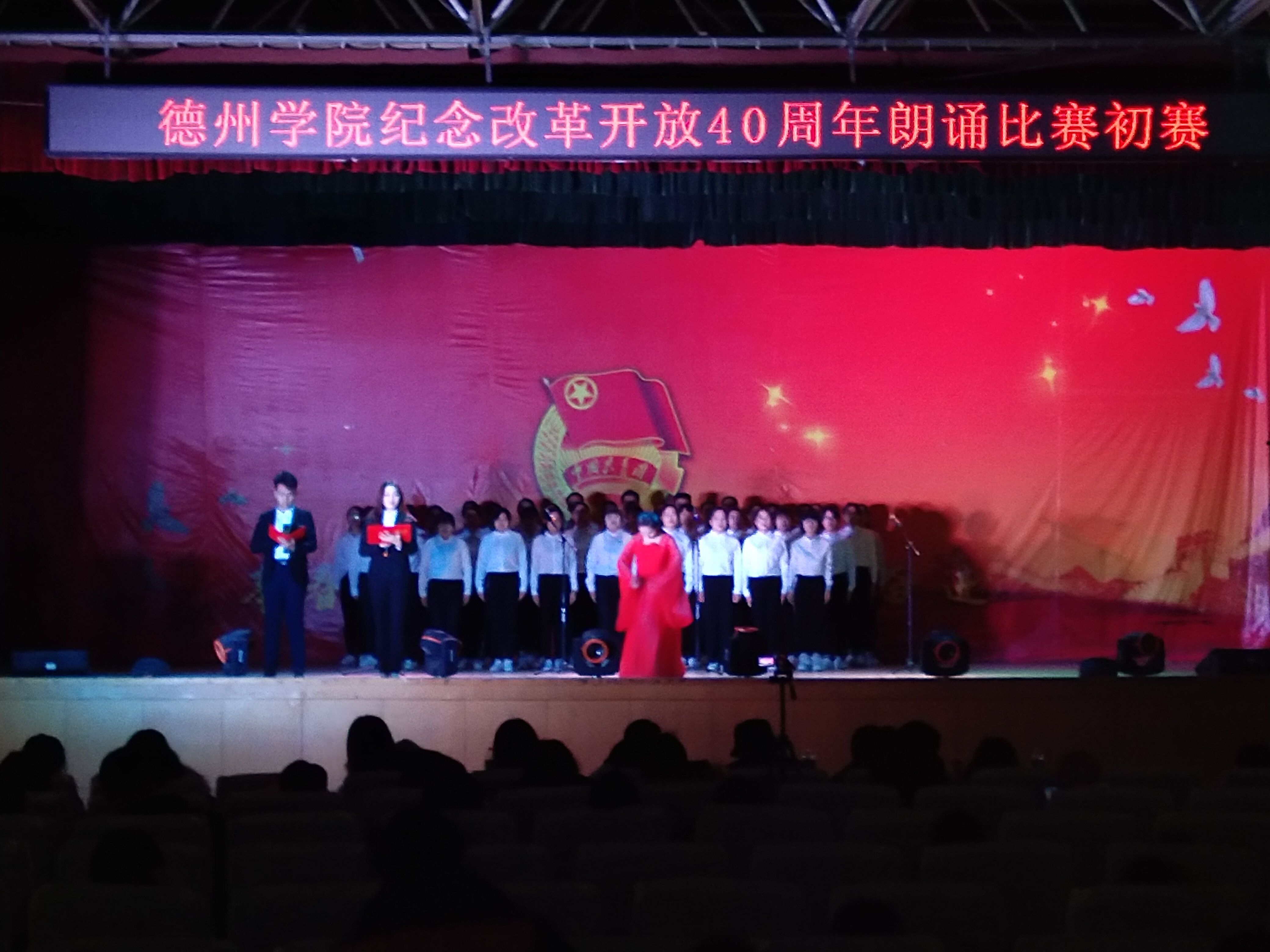 为了讴歌我国改革开放四十年取得的伟大成就,歌颂中国共产党。德州学院于2018年12月19日在青年之家开展了以“赞美祖国,赞美人民”为主题的经典朗诵比赛,医药与护理学院积极参加,并斩获二等奖的好成绩。