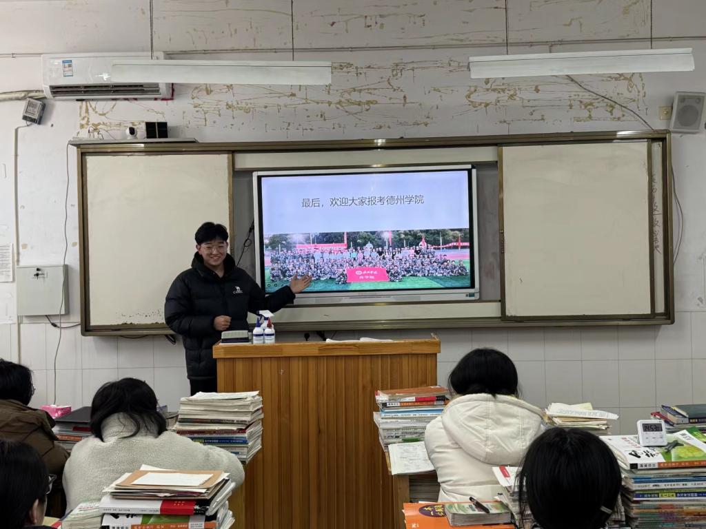 同学们精心筹备宣讲资料,借助主题班会、发放报考指南、咨询答疑等多样形式,全方位展示德院魅力。在招生宣讲中,同学们向高中师生发放德州学院2025年报考指南,结合往年招生数据,详细介绍各专业预估招生位次,耐心解答考生疑问;在讲述德院育人成果环节,同学们围绕高水平、有特色、国际化应用型大学建设目标,从学科建设、人才培养、师资队伍、就业深造、国际交流、招生政策等方面,全面呈现学校办学育人成就;同时结合自身经历,分享在德院的学习生活、社团活动、学科竞赛、饮食住宿及校园环境等情况,让德院校园生活鲜活地展现在中学师生眼前。互动环节中,大家积极提问,现场气氛热烈。