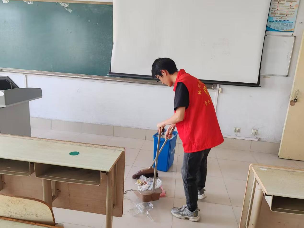 活动中,志愿者走进考研自习室,合理分工、高效协作,用除胶剂、清洁剂等工具,细致清除桌面涂鸦、胶带残迹,整理讲台散落资料;对损坏吊灯、接触不良插座及时报修;深度清扫地面垃圾与桌洞杂物。此外,志愿者在教室内张贴“累了就抬头看看窗外,你比星光更耀眼”等暖心标语,用点滴关怀为学子注入精神动力。
