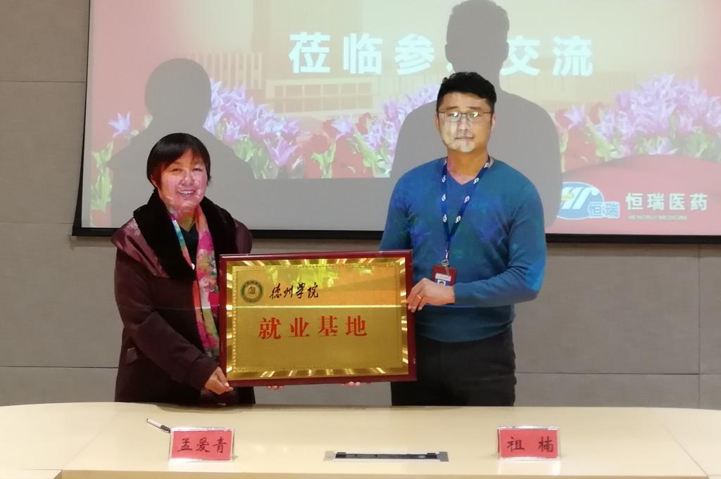 江苏恒瑞医药股份有限公司成立于1970年,是集科研、生产和销售为一体的大型医药上市企业,目前是中国最大的抗肿瘤药、手术用药和造影剂的研发和生产基地,中国医药行业综合创新实力第一,中国市值最大的医药上市公司。该企业需要大量医药、护理相关专业的毕业生进行实习、就业。我院一行对公司宣传展厅、生产车间、企业文化等进行详细考察。双方就实习、就业合作进行深入座谈交流。公司代表阐明了医药、护理类专业学生的就业渠道和前景,并提出用人需求,我院相关负责人对学生的专业、毕业、就业情况作了总结,双方进一步明确了就业合作意向。考察交流结束后院企双方签署“德州学院就业基地共建协议书”并举行就业基地挂牌仪式。