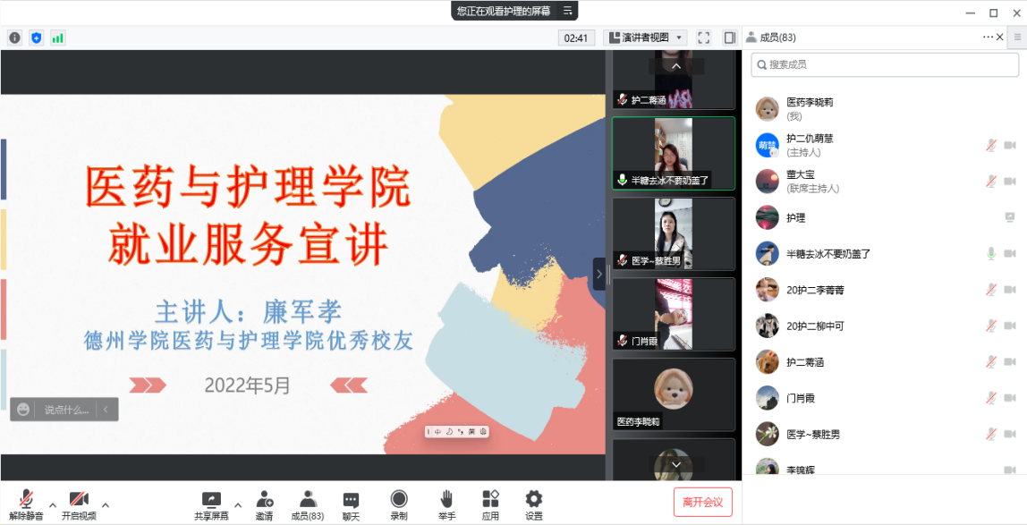 5月11日,由德州学院医药与护理学院举办的高校毕业生就业指导线上服务会在腾讯会议顺利举行。此次活动旨在帮助护理学毕业生解决疫情防控下较为严峻的就业择业问题,引导毕业生端正就业态度,树立正确的职场价值观,全体护理学毕业生参加。