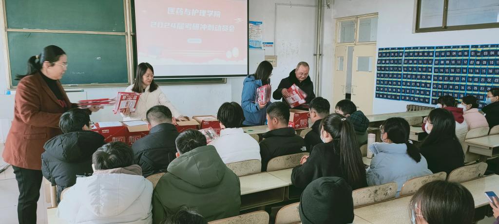 心中有梦想,笔下是征途,距离2024年研究生考试还有16天。为激励2024届考研学子坚定备考信心,做好考研冲刺准备,医药与护理学院于2023年12月7日上午在体育楼414教室举行了“2024届考研冲刺动员大会”,并为200余名考研学子送上暖心大礼包。学院党委书记、副书记、教师代表、辅导员及全体2024届考研学子参加了本次活动。